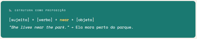 Como preposição, "near" estabelece uma relação de proximidade entre dois elementos. É equivalente a "close to", e sempre é seguido de um objeto (substantivo, pronome ou sintagma nominal).