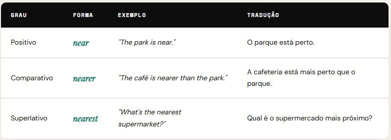 A palavra "near" é um flat adverb ou seja, tem a mesma forma tanto para o Advérbio quanto para o Adjetivo, sem o sufixo "ly" que é marca registrada de advérbios em inglês! E você sabe que com Advérbios e Adjetivos podemos fazer o grau Superlativo e o Comparativo, não é mesmo? Vamos ver alguns exemplos: