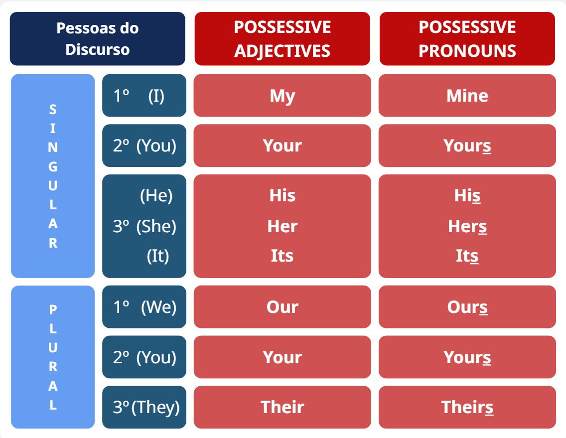 Os Possessive Adjectives não devem ser confundidos com os Possessive Pronouns!!! Como sabemos, a função de um pronome é substituir um nome e a função de um adjetivo é acompanhar ou modificar um substantivo. Enquanto os Possessive Adjectives acompanham o substantivo, os Possessive Pronouns os substituem, para que se evite repetições indesejadas em uma frase. Ou seja, os Possessive Pronouns substituem a construção composta de Possessive Adjective + Substantivo.