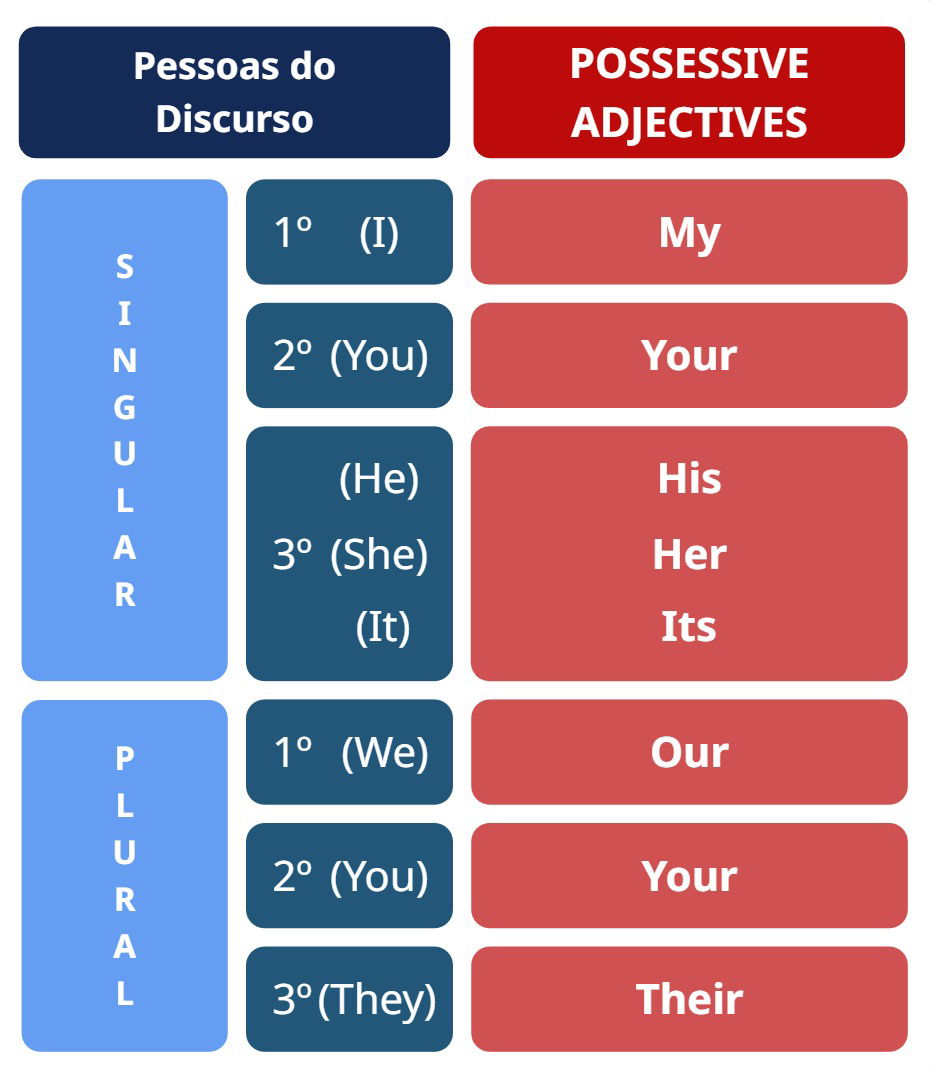 Os Possessive Adjectives podem ser usados acompanhando palavras que representam objetos, animais ou para indicar o que uma pessoa representa. Observe: